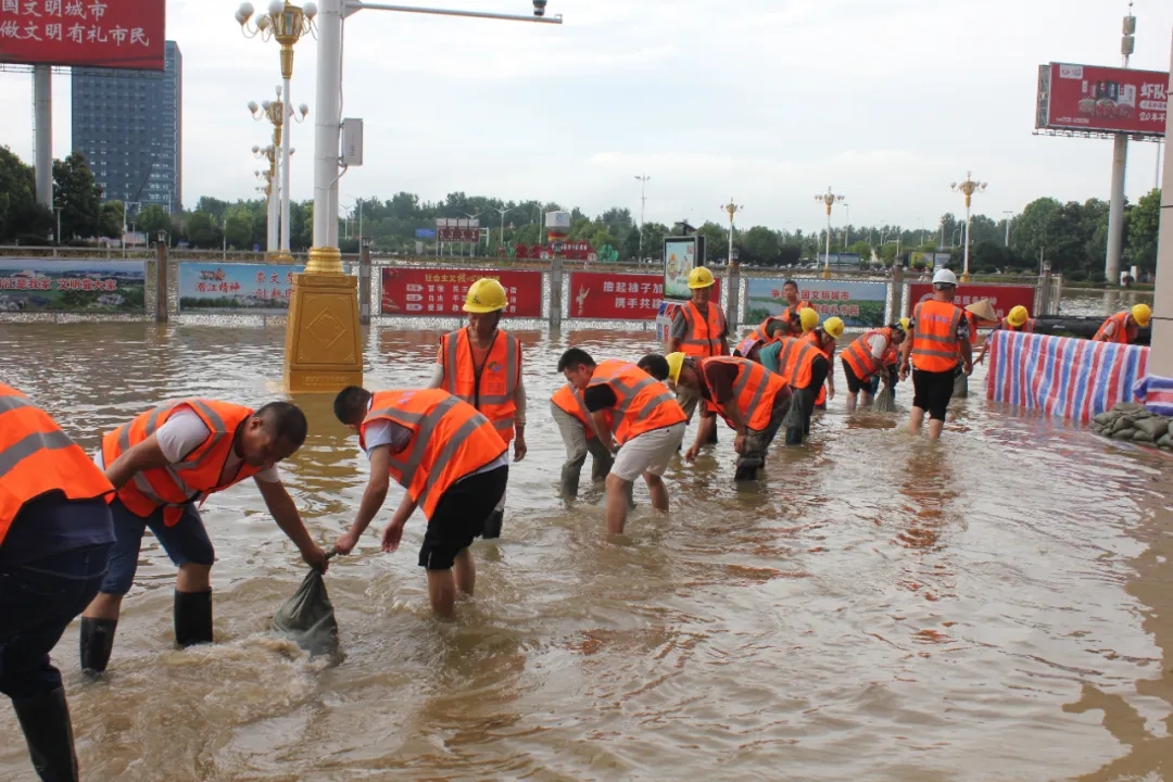 黨員干部沖鋒在前,員工齊心協(xié)力排澇。他們擼起袖子,卷起褲管,趟著齊膝深的水,冒雨組成“長(zhǎng)龍”轉(zhuǎn)運(yùn)沙包,堵缺口,阻溢水。