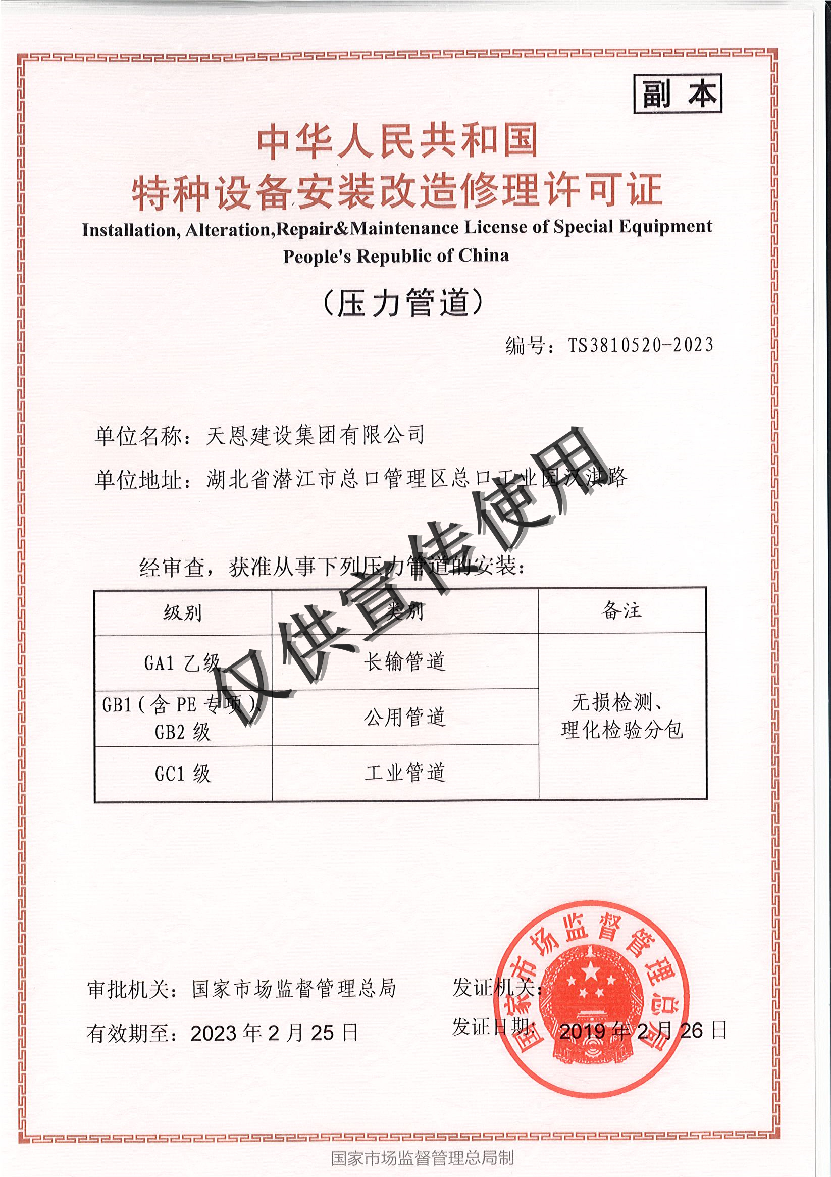 壓力管道 特種設備安裝改造維修許可證